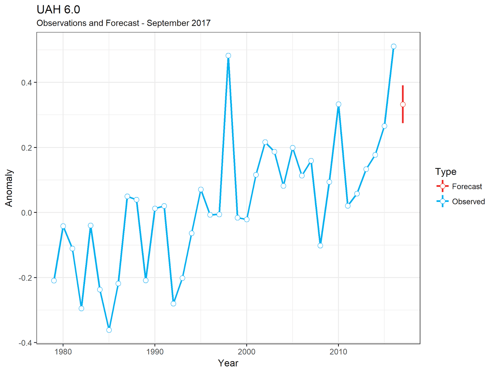 Annual Observations and Forecast for 2017 for GISS Surface Temperatures, based on data up to August 2017.